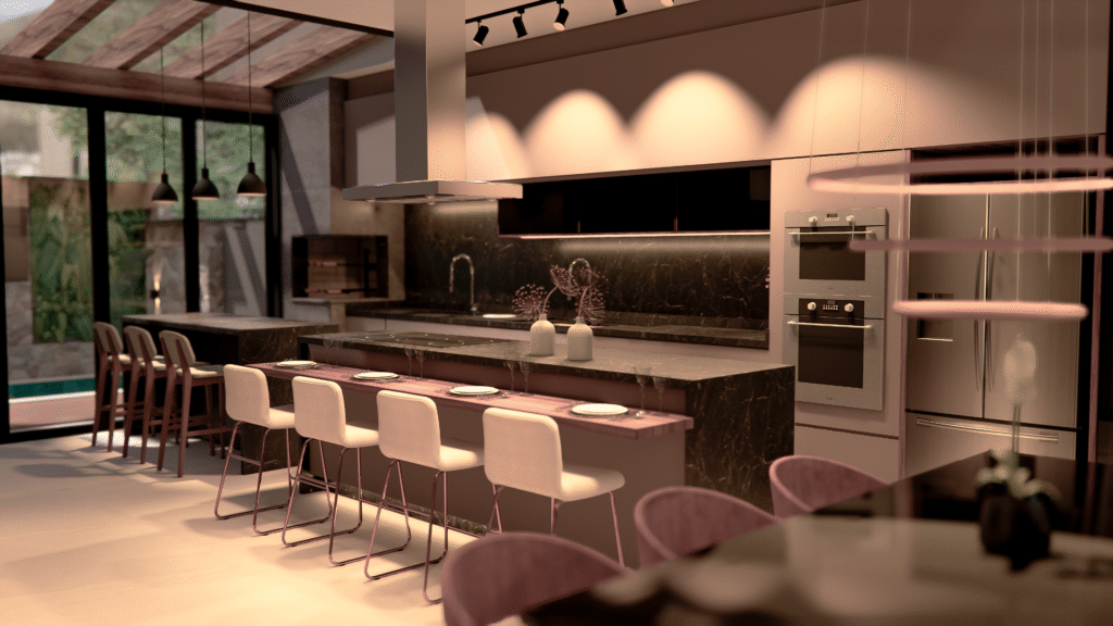 Enquanto a imagem estática mostra um único ângulo, a animação 3D permite apresentar o projeto de forma dinâmica, conduzindo o cliente por todos os ambientes com fluidez, música e realismo — como um tour virtual em vídeo.